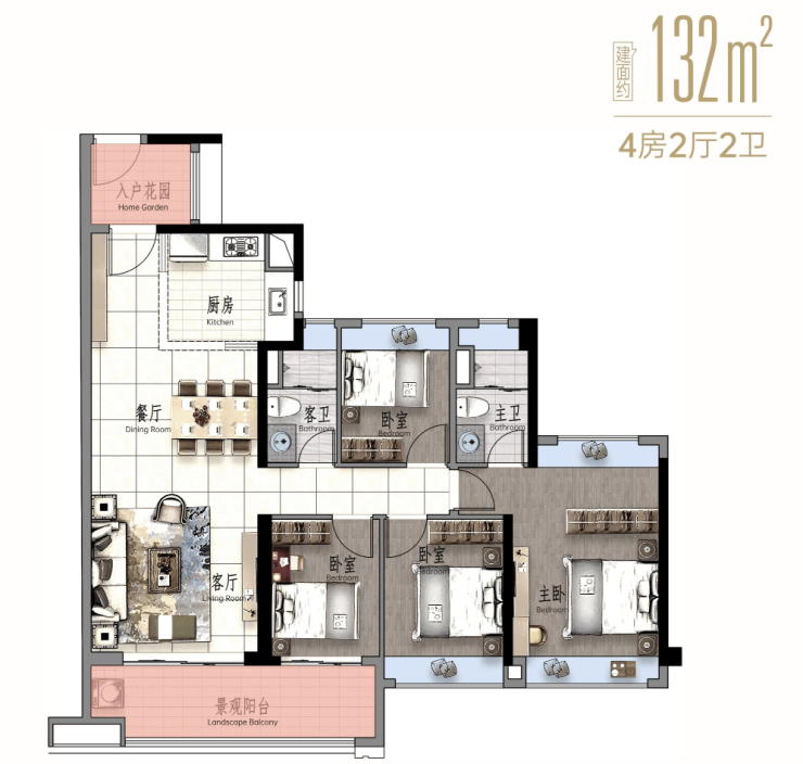 约99㎡3+1房2卫,户型升级,灵动入户空间,南向约6米阳台,尽揽自然景观,主卧套房,私密生活。