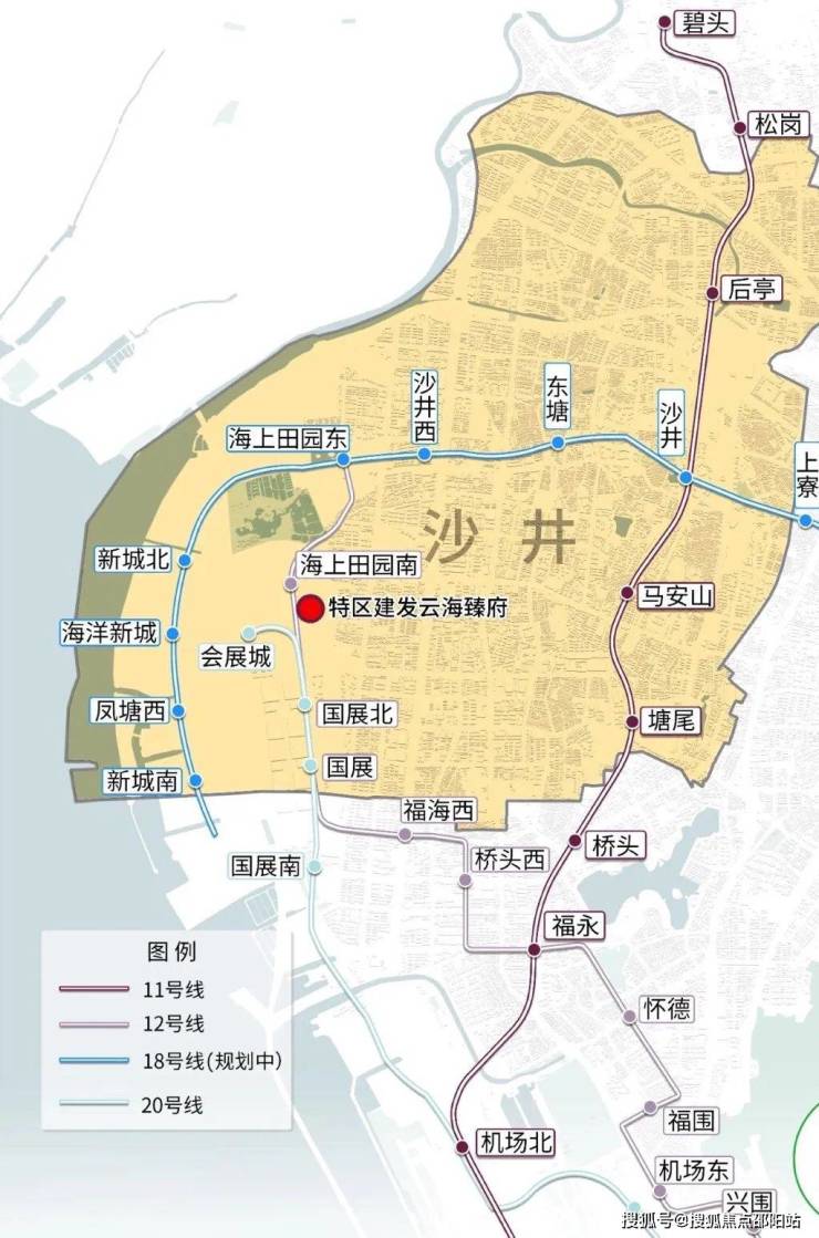 云海臻府地块位于宝安区沙井街道展景路一侧,邻近建设中的 12 号线海上田园南站。与海上田园南站直线距离约250米(根据百度地图测量,仅供参考)。未来将可以通过12号线方便通达宝安西乡、南山传统中心区、蛇口自贸区等区域。