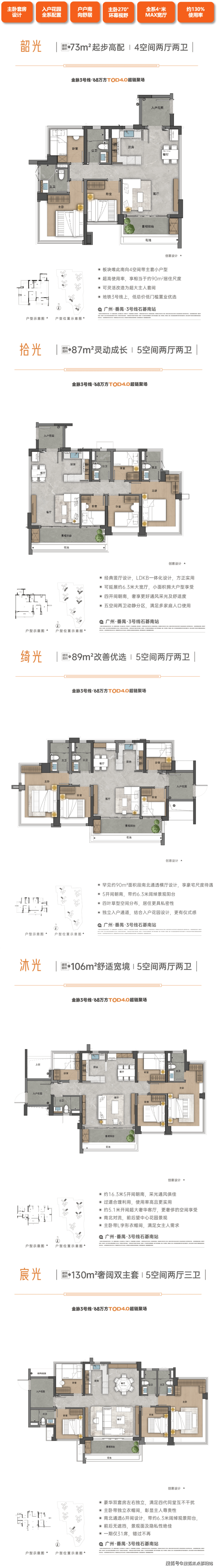 项目提供高使用率户型,超130%得房率,户户朝南,270°环幕观景,主推四至五房产品。全系户型均赠送入户花园,并配备超4米宽厅设计,空间感十足。例如: