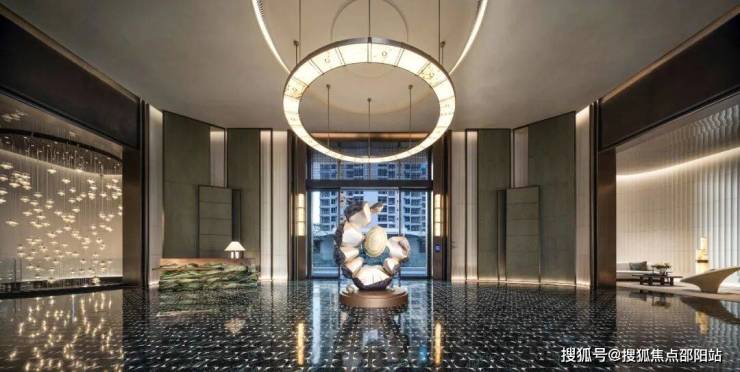 酒店式精装设计的入户大堂同样让人惊艳,弧形造型的景墙、鱼肚白石材搭配太古黑金石材定制方胜纹样的地面、天珺特色奢石星空猫眼绿搭配长条发光白玉石的墙面,每一处都尽显极致空间感。难怪有客户说,参观这里就像一场穿越风景的自然漫旅游。