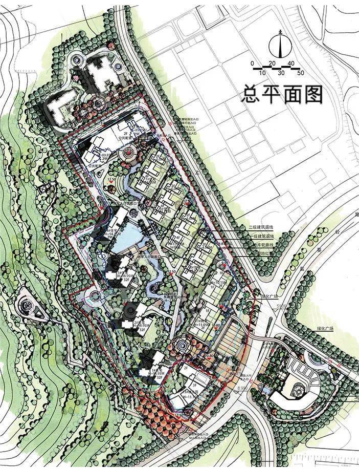 西侧布置了6栋高层住宅,均为底层架空设计;利用西南角低洼区域布置幼儿园,即可满足日照需求,保证住宅到达幼儿园的便利性,又可保证住宅小区的完整性,将幼儿园对住宅的影响降至最低。