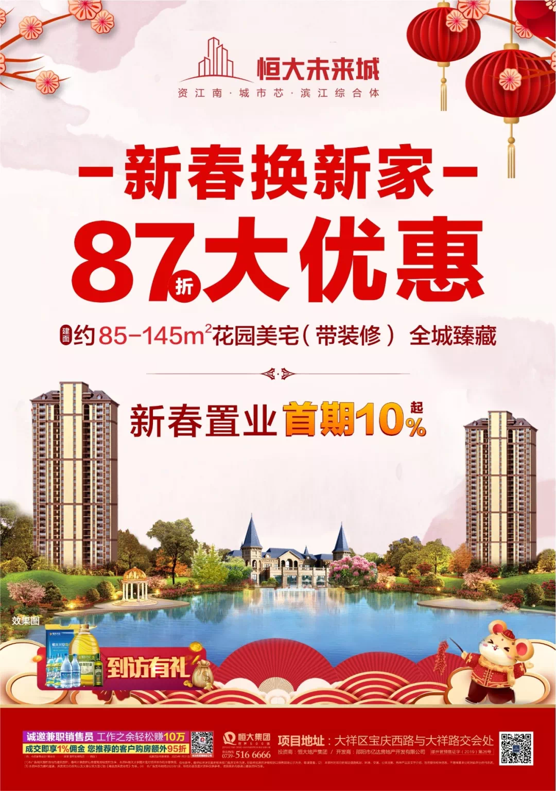 邵阳恒大未来城 雄踞城芯,为品质生活加冕 欧式园林,定义诗意栖居生活 9A精装,匠心筑造宜居生活 您的购房上佳之选 新春换新家 87折大优惠 新春大抽奖 豪礼享不停 现场华为手机,家电礼包直接派送!