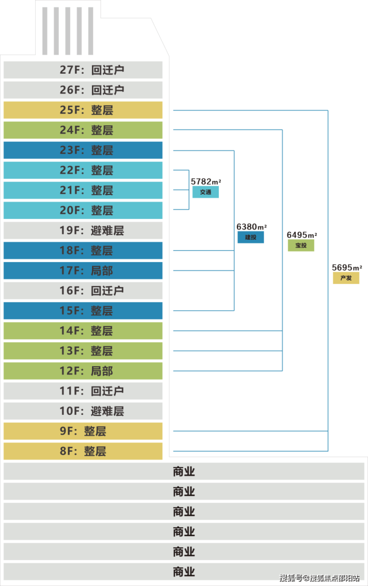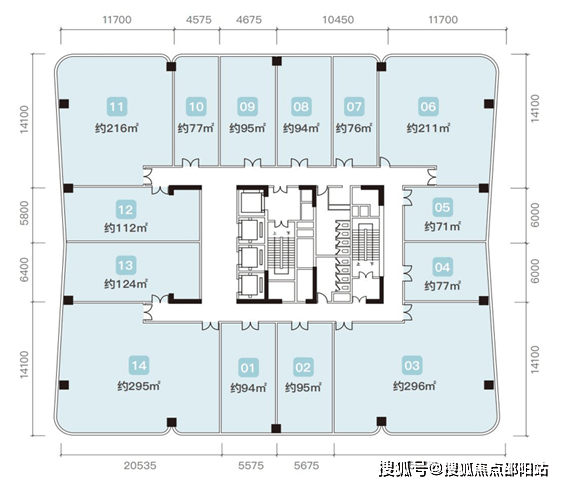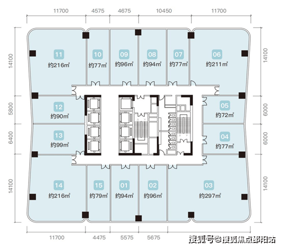 大厦地下3层为停车场,共1361个车位;地上27层,其中1-4层为自带的约3.7万㎡裙楼商业,办公区域标准层面积约1900㎡,约4.4m舒适层高,每层14套,提供70-296㎡办公空间,满足不同规模企业的需求。