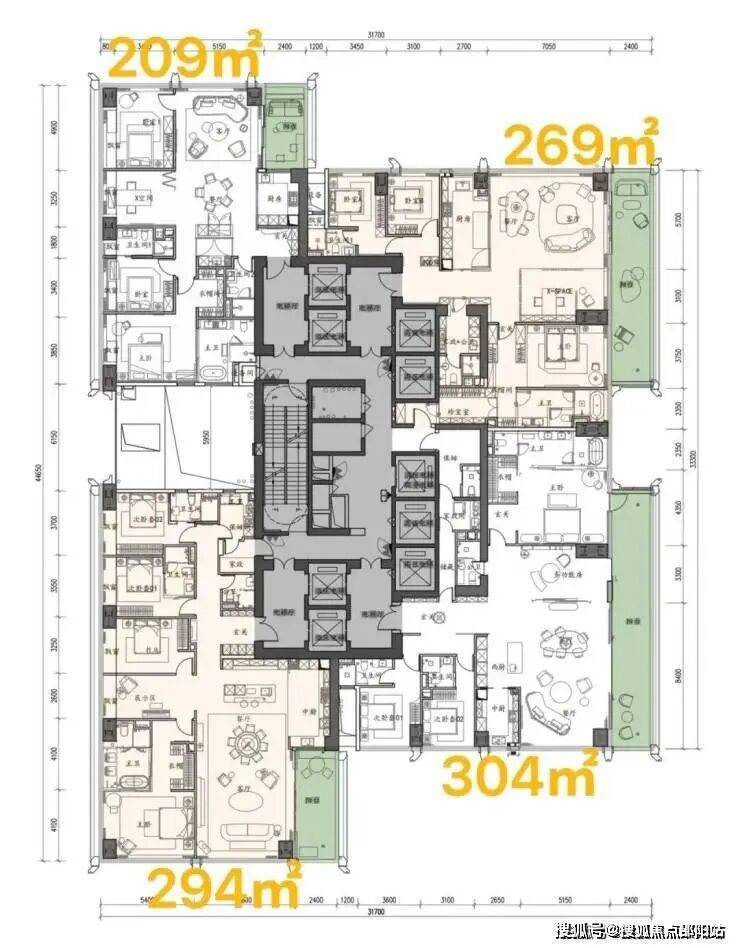 项目容积率7.59,限高250米,规划5栋超高层住宅,采用全玻璃幕墙设计,实用率高达92%以上,主力户型200㎡以上大平层,住宅约506套。