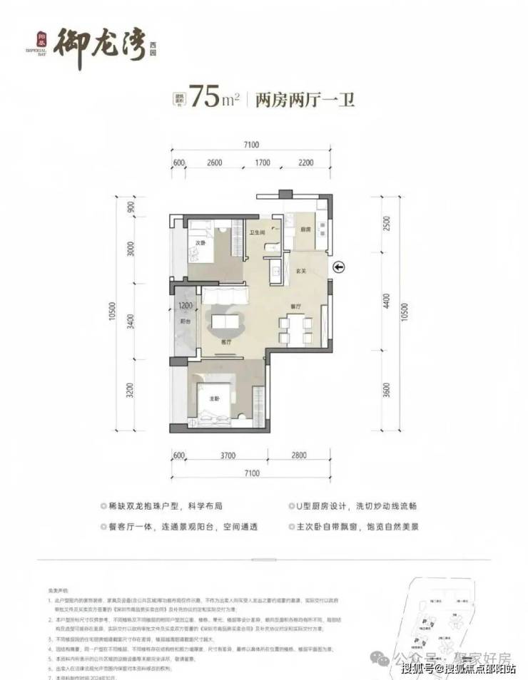 75㎡2房1卫,分布在1栋3/4单元03/06户型,设计的是竖厅稀缺的双龙抱珠格局,客厅开间3.4米,U型厨房,卫生间三段式分离设计,得房率约73.26%(不含赠送),东南或西北朝向,加上赠送得房率约80%