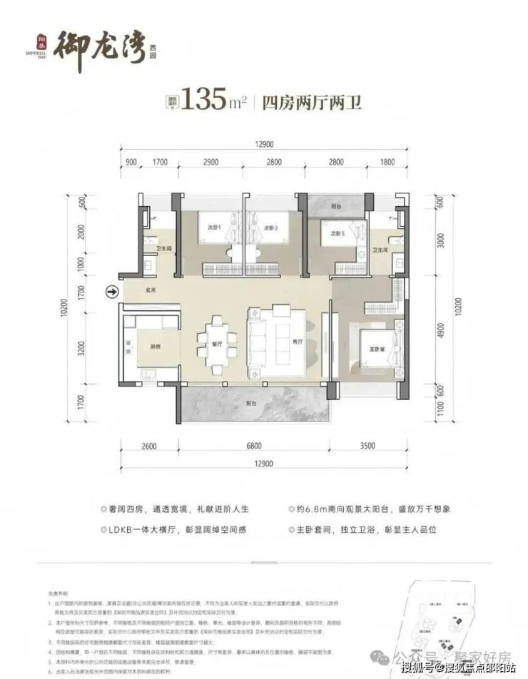 135㎡4房2卫,设计的是横厅南北通透格局,客餐厅开间6.8米,LDKB一体化设计,四开间朝南,U型厨房,公卫三段式分离设计,得房率约79.25%(不含赠送),阳台主朝东南或西南向,加上赠送得房率约90%