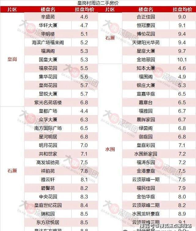 咖姐整理了皇岗村周边近一公里的房价,我们来看目前周边二手房价如何: