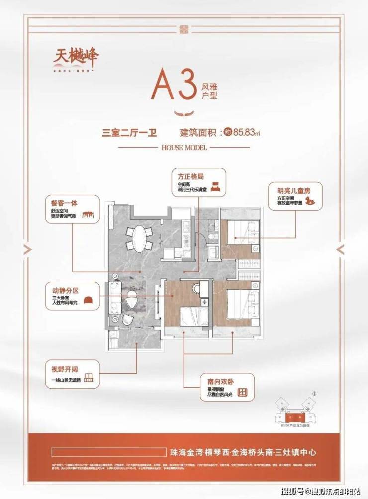 由天樾峰公馆倾力敬献珠海的产品,涵盖85.67三房两厅一卫、85.83㎡三房两厅一卫、100.91㎡三房两厅两卫三个户型,专为成长性家庭而准备。
