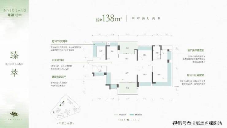 建面约138㎡四房两卫(臻萃):超16米南向巨幕面宽,四开间朝南。南北双景观阳台,采光、通风、观景三重升级。约29㎡超广角环幕套卧,私属独立衣帽间/盥洗室,酒店式体验。X灵动百变空间,满足多元定制需求。客厅开间6.4米,标准的豪宅居住尺度。实用率超100%,媲美市面约150㎡大平层体验。