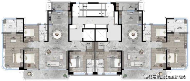 这个户型是四开间朝南的双套房,主卧套房同样是270度的弧面转角窗设计。每一个卫生间,都是自然通风的全明设计。