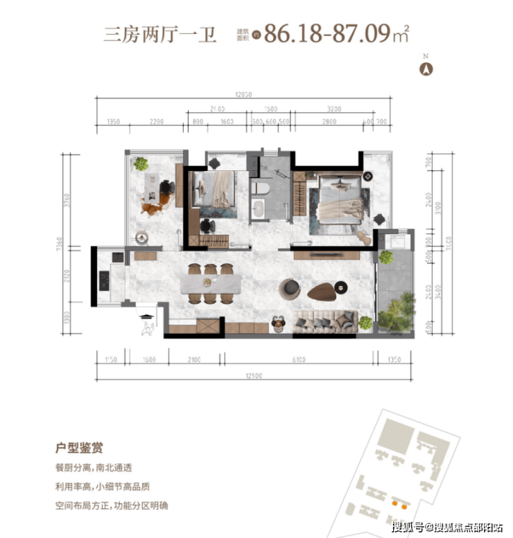 户型1:该户型建面约86.18-87.09㎡,三房两厅格局。餐厨分离,南北通透,利用率高,小细节高品质,空间布局方正,功能分区明确。