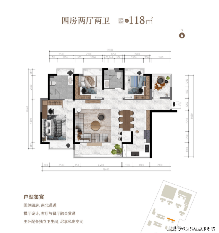 户型2:该户型建面约118.8㎡,四房两厅两卫格局。阔绰四房,南北通透,横厅设计,客厅与餐厅融会贯通,主卧配备独立卫生间,尽享私密空间。