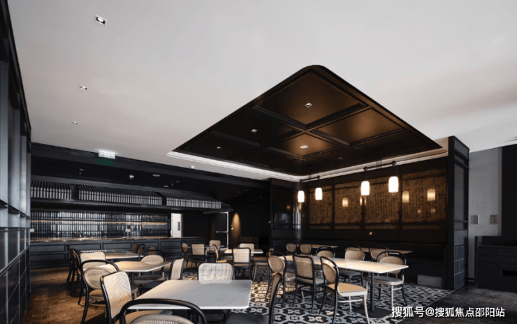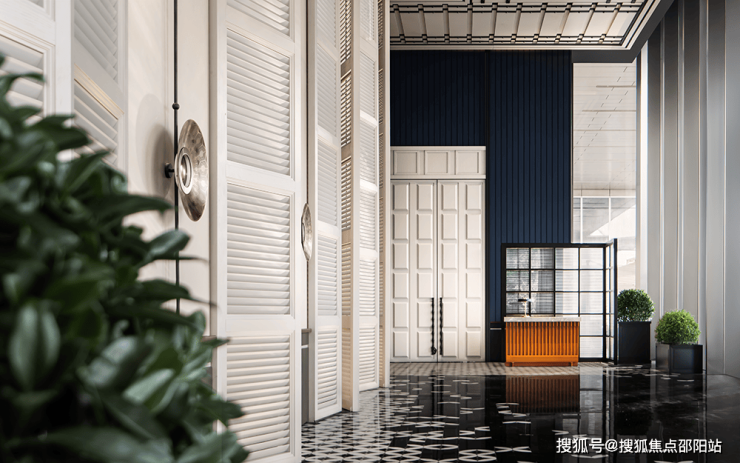 接待大堂的古典又现代的柱廊,造型简洁的天花呈现立体阵列状,无明显的中式符号,却显现出东方的庄重大气。地面法式的鱼骨纹拼接木地板,强化了空间视觉上的延伸感。吊灯