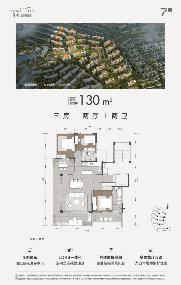 |建筑面积约133㎡○户型方正,全明采光,让海风阳光自在穿行○约8.5m阔景横厅,度假姿态尽显○LDKB专享度假感格局,清晰分区○主卧套房,连接约6m度假阳台,舒阔有度○南向四开间,阳光在家里尽情撒欢○朗阔花园,独立入户,住进自然里
