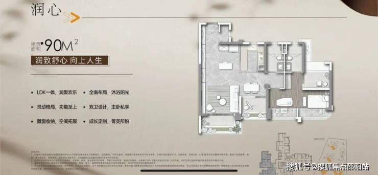 建面约90㎡的户型,采用了四开间朝南的设计,这意味着整个户型的四个主要房间都面向南方,可以获得充足的阳光和自然光线。南向采光通常被认为是最理想的,因为它可以提供更温暖和明亮的室内环境。