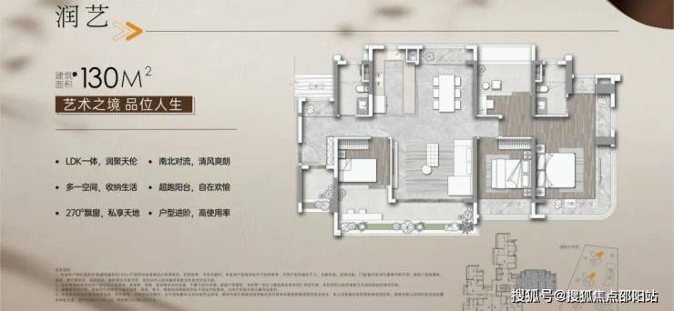 建面约130㎡的户 型, 在设计上几乎完全被飘窗和阳台所包围,这为户型提供了绝佳的光照条件。这个户型的特点是南向、北向和东向几乎都能够实现全面采光。