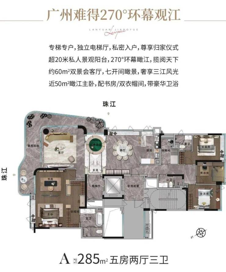9, 户型设计:户型设计合理,空间利用率高,确保了业主的居住舒适度。专梯专户、望江双主卧、270°江景阳台等设计提供了奢华的居住体验。