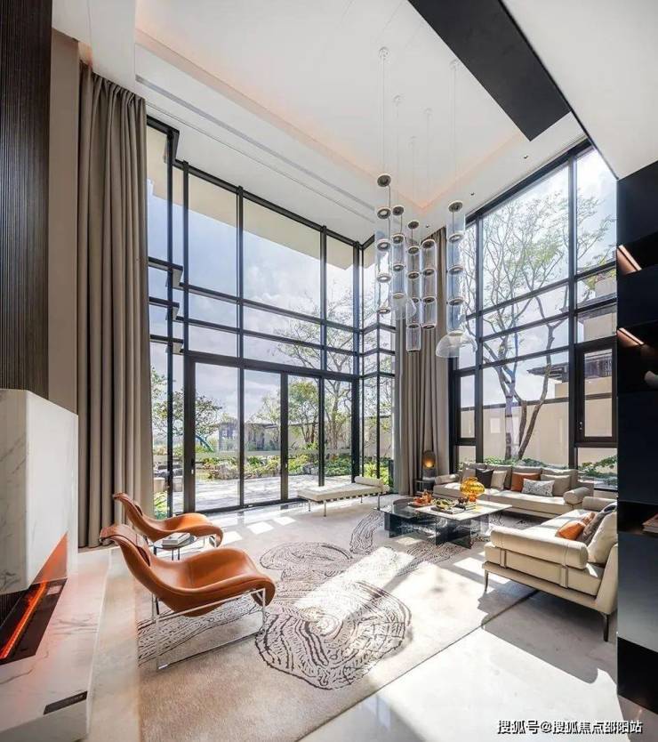 通过客餐厅挑空区穿透和开放的处理方式,形成垂直空间的交流互动。各功能空间分明,动向流畅又紧密相连,丰富空间的同时也使空间更有趣。而客餐厅挑高的天花和大面积的落地窗为空间创造了更好的通风、采光同时也更好的将外景引入室内,开阔场域视觉,营造优雅环境,诠释艺术与生活的诗意……