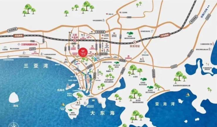 【交通配套】:地段绝佳,城市核心区。凤凰路的中段,项目与三亚湾直线距离不到5公里。3分钟可达三亚高铁站、10分钟可达三亚绕城高速、15分钟可达三亚凤凰国际机场。新修建的轻轨电车紧邻项目,步行3分钟即可到达凤凰路站乘坐。