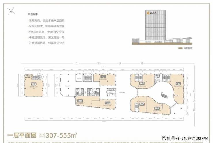 项目主体由一栋高99.9米的22层塔楼及南北两侧裙楼组成。