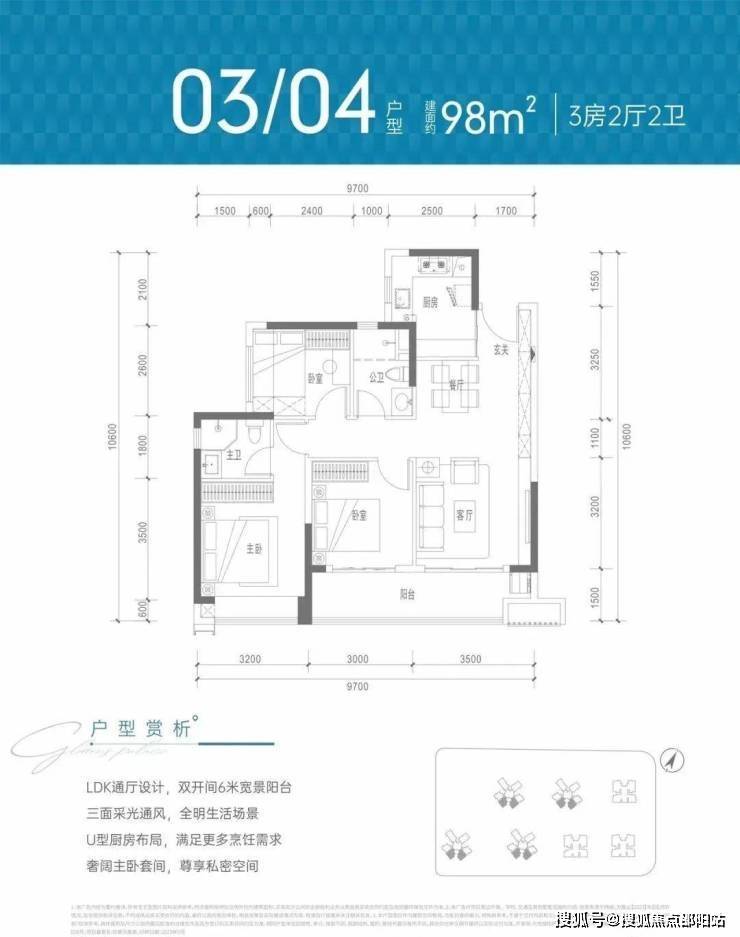 传统竖厅格局,动静分区,客厅开间约3.5米,主卧开间约3.2米,两个次卧开间约3米、约2.6米,约6.5米大阳台连接客厅和次卧;03户型西南户型,04户型东南朝向。