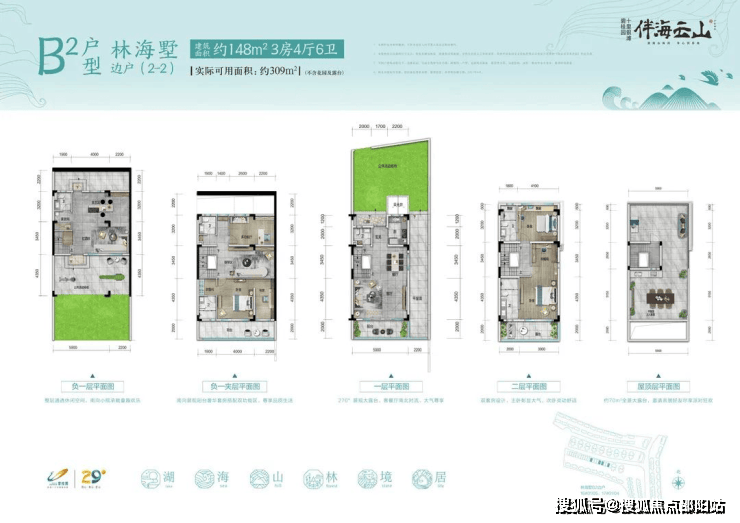 该户型共5层,不计花园与露台实际可用面积约309平;你还可以根据自身需求,将3房改造成5房使用。