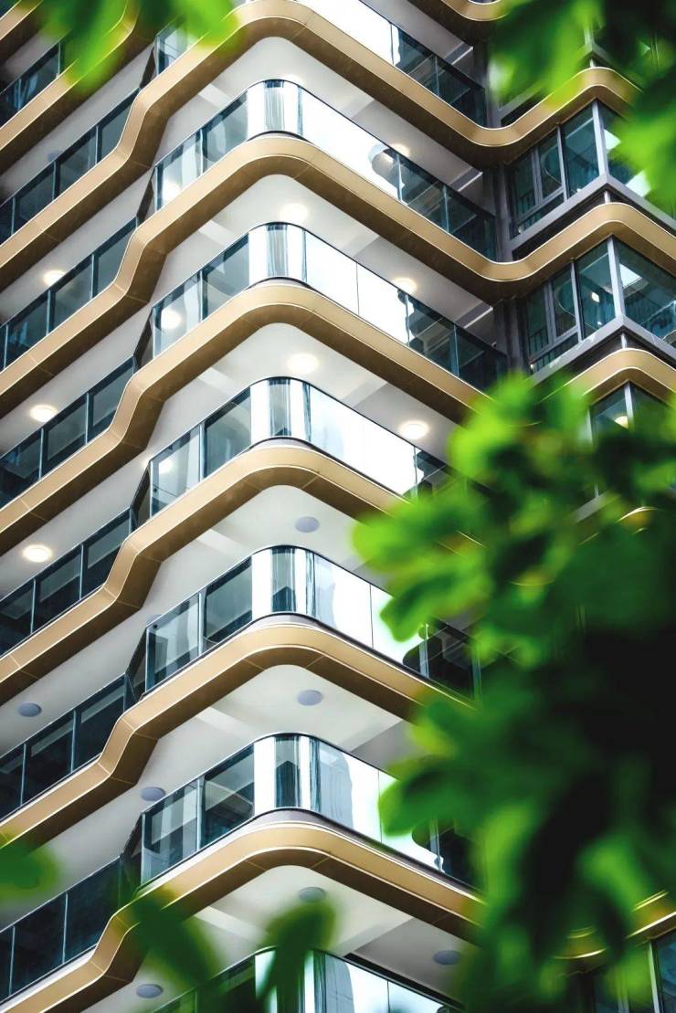 设计师以"扬帆轻舟"为灵感,将弧形塔冠、滨海特色弧形阳台与香槟金金属线条融合,远远望去仿佛海浪冲刷过的礁石轮廓,形成极具辨识度的滨海建筑轮廓。