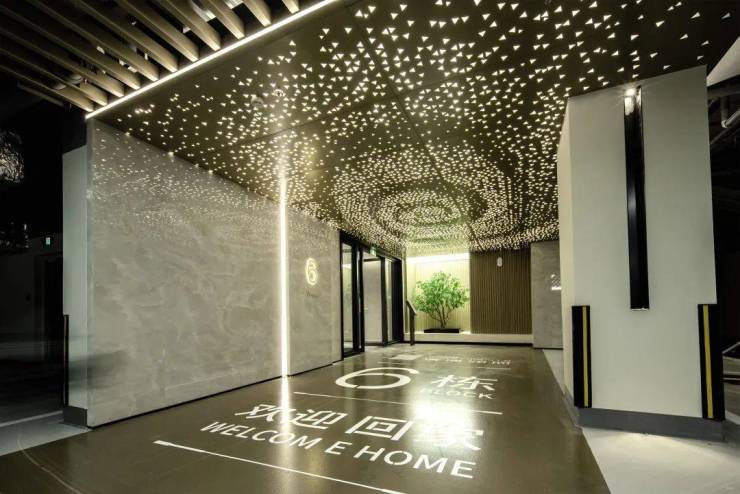 坡道线性灯+透光金属网强化仪式感,主车道灯光导视,泛大堂端景模拟自然光绿植造景,将酒店式归家礼仪延伸至地下空间。