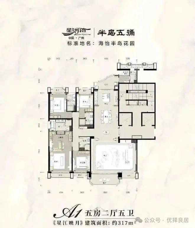 A1星涵印翠(约317㎡):五房环江巨幕平层,九宫格宫殿格局,中西双厨+全屋智能家居。