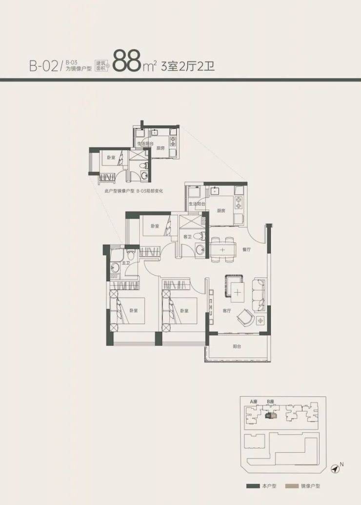 南北通透四房户型,是「京地海樾府」最大的户型,主阳台朝西北,生活阳台朝东南。同样位于1B座的2梯4户结构,这个户型只有58套,适合改善需求和周边本地人置业。