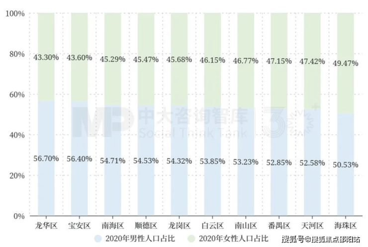 就性别结构而言,2020年,前10强区县中,男性人口均多于女性人口,其中,深圳市龙华区、深圳市宝安区男女比例差值均超过10%;相比之下,广州市海珠区最接近性别比例均衡的状态,差值仅为2.12%(见图 2)。