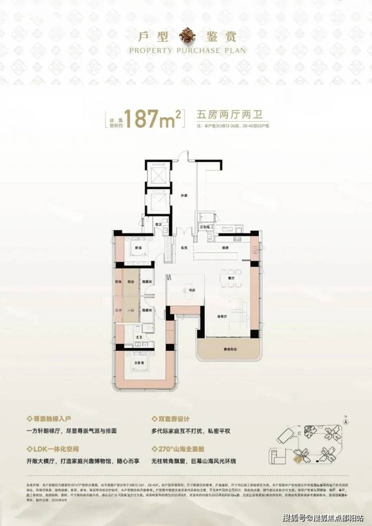 187㎡的5房2厅2卫,设计的是竖厅格局,尊享独立电梯入户,LDKB一体化设计,动静分区,三开间朝南,主卧270°无柱转角全景舱,L型厨房+岛台中西厨设计,公卫三段式干湿分离,得房率约111%(包含赠送),西南朝向看海景景观。