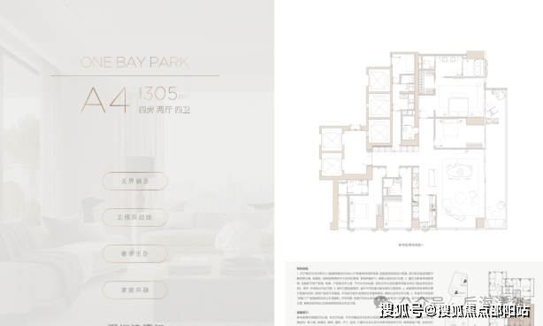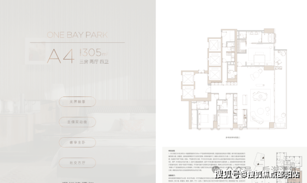305㎡户型:余量仅1-2套,总价约5200万。四房四卫的豪华配置搭配专梯入户,叠加板楼东西通透的优势,东向阳台直望人才公园与海景。