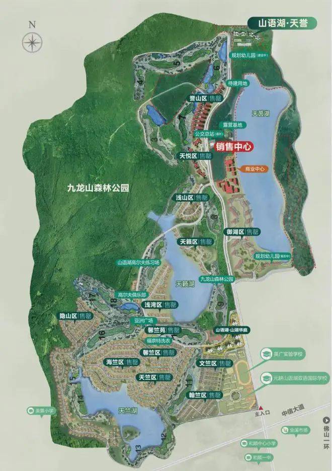 小区配套:2000亩九龙山森林公园、1200亩三大天然湖区(天竺湖、天籁湖、天茵湖)、1600亩18洞私家精品高尔夫球场、沿湖步道、湖畔大草坪、亚洲广场、近2万㎡商业中心山湖天街等。