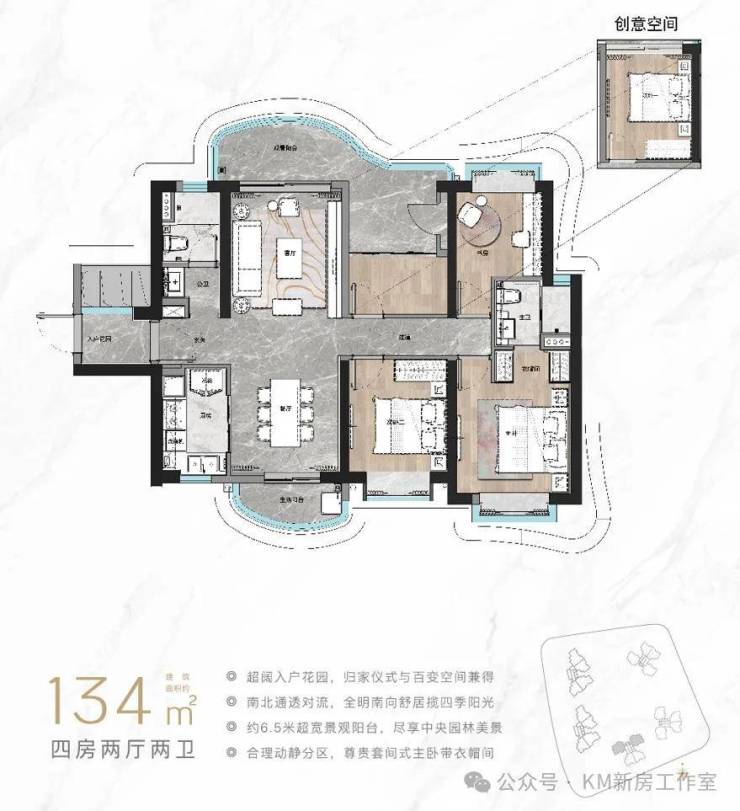 建面约132㎡ 四房两厅两卫:全明空间+双套房设计,270°转角阳台连接书房与客厅,飘窗系统最大化引入江风与光影,满足多代家庭的全场景需求。