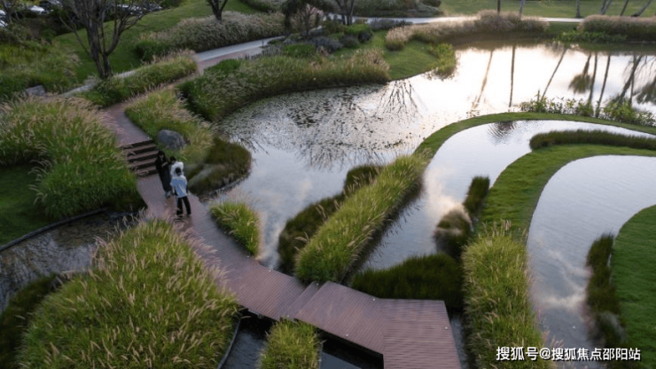 我们以“溪”元素贯穿,水以不同的尺度、形态迂回于整条景观带中。峡谷空间由西向东逐渐变窄,活动空间由动至静。草坪连接着池塘,利用高差错落塑造了野趣的乡野画面(图3、图4)。