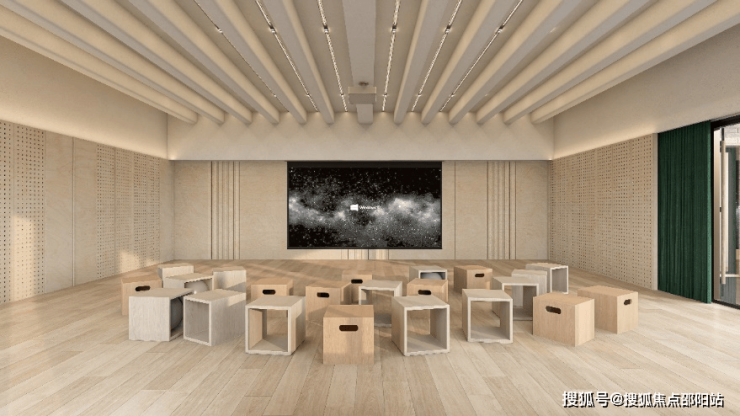 山谷聚场:配套空间循自然设计,原木肌理 + 光影廊道,互动与休憩场景兼顾实用与美学
