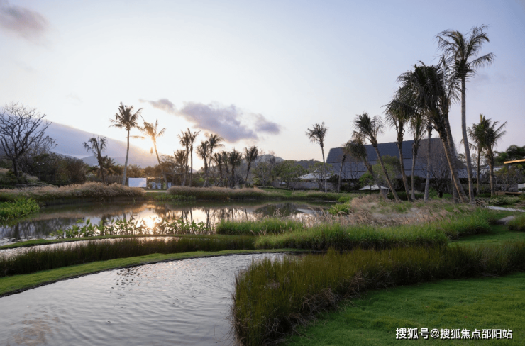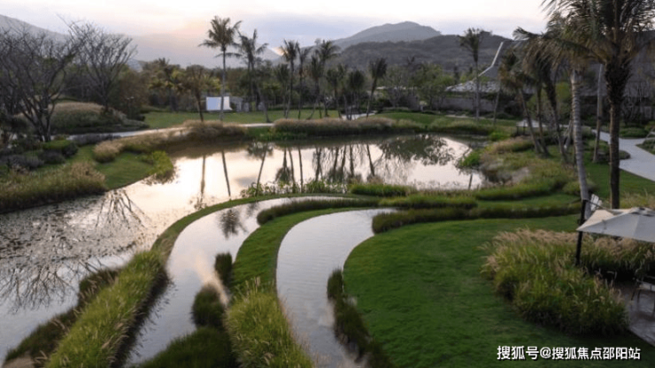 池塘彼岸是雨林风情商业街,是绝佳的夕阳观赏点,通过低维护方式创造出自然的水岸线和起伏的岸坡(图5、图6)。