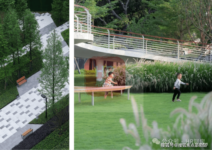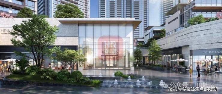 项目匠造约2.5万㎡中心花园,阶梯式双层园景,下层与商业相连活力满分,上层静谧私享,现代简约审美,以园林谧境回应新贵都心绿洲向往。
