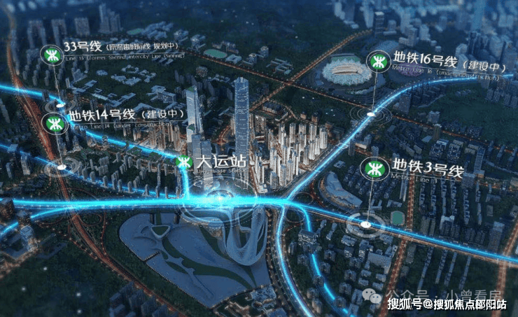 湾区之舞大运枢纽站标杆大盘,四轨交汇,地铁3号线和14号线、16号线和33号线(建设中),大运站将成为深圳东部大型交通枢纽,毗邻水官高速、机荷高速、惠盐高速等高速路网,多维交通网络,以速度激活全域,高效畅达湾区。