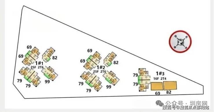 其中1栋1-2单元单元25层约80米高,2梯6户;1栋3单元16层约53米高,住宅总共有332户,配360辆车位。
