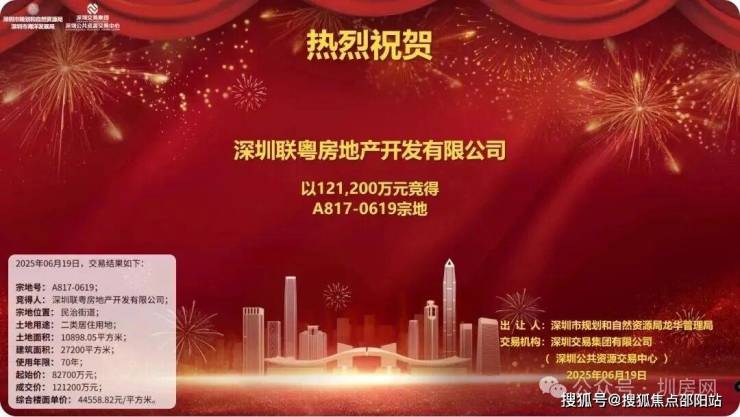该地块是深圳2025年经过30分钟65轮竞争,最终联发地产以12.12亿元斩获龙华A817-0619宗地,溢价46.6%。
