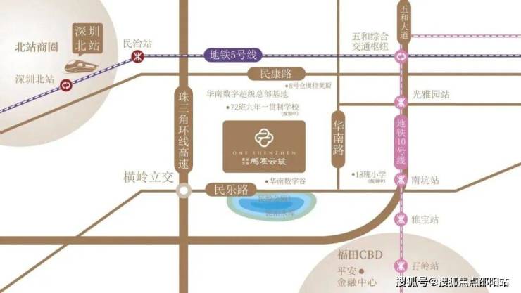 交通方面,项目距离10号线南坑站约700米,距离光雅站约850米。周边还有5号线民治站,6号线白石龙站,及规划中的22号线,地铁通勤便利。项目周边道路有珠三角环线高速、五和大道、民乐路等,可快速到达深圳各核心区域。