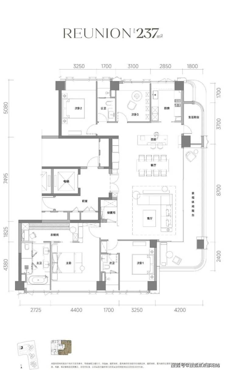 建面约237㎡户型,含电梯厅综合赠送后使用率可达93-95%。
