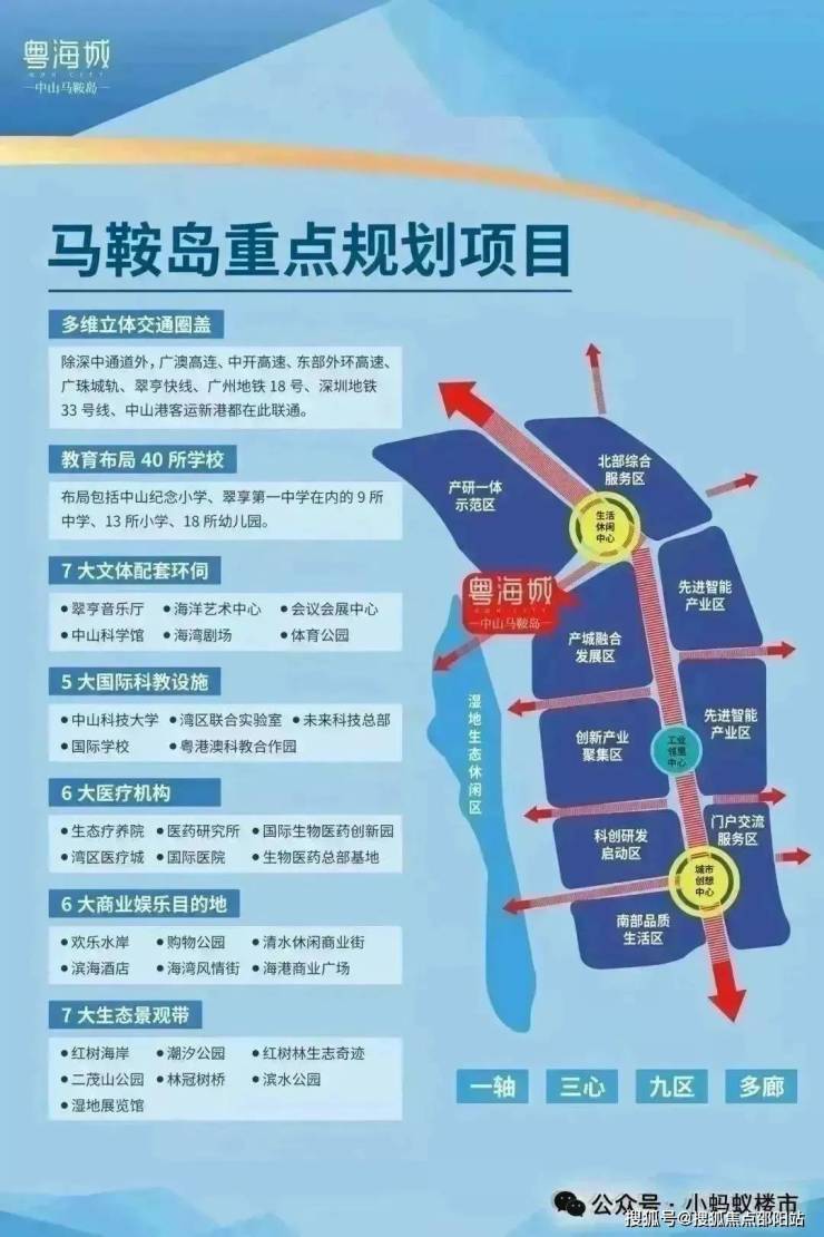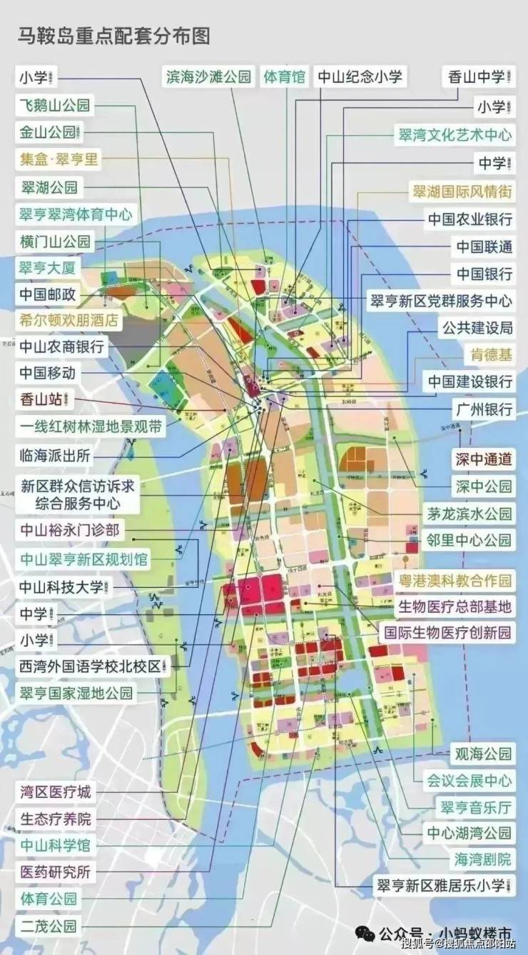 规划显示,马鞍岛将打造为 “国际化、现代化、创新型城市新中心” ,规划建设40所学校、7所医院、13个生态公园和6大商业集群。随着中山科技大学选址翠亨新区,医疗城、生物医药总部基地等高端配套相继落地,区域价值正迎来爆发前夜。