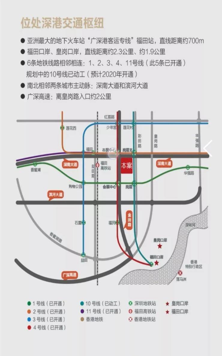 9大功能中心,拥有国际都会生活圈的城市配套(全深圳80%的金融机构,莲花山、深圳图书馆、音乐厅、书城、博物馆、少年宫、当代艺术中心、关山月美术馆等富有深圳文化的涵养之地;更囊括了全深圳60%五星级酒店、5家超级shopping mall等城市配套;商务、购物、娱乐、休憩、居住随意切换)。