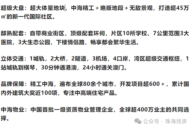 绝版地段:左手澳门、右手横琴,复合双区利好。与横琴直线距离527米,与澳门直线距离1.4公里,承接琴澳人口、经济等外溢资源最直接的区域。