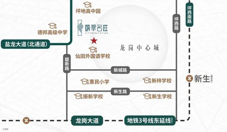 地铁三号线延长线在建,二十一号线规划中在建,紧挨龙岗大道,盐龙大道,外环高速环绕,出行交通便捷,出则繁华!