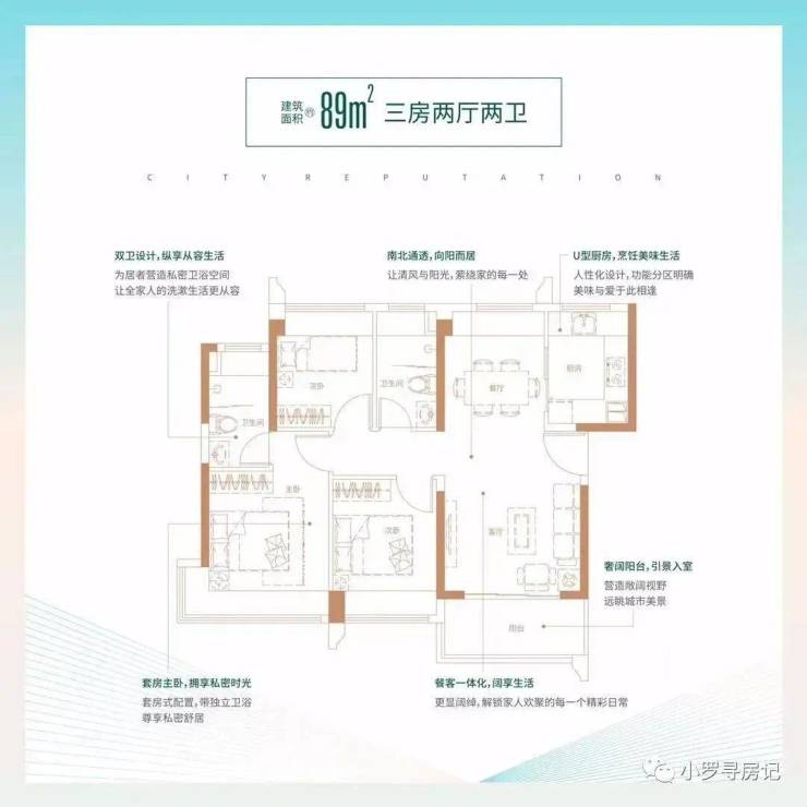 89㎡的3房2厅2卫,5栋02户型,设计的是经典竖厅格局,客厅3.6米开间,LDKB一体化,动静分区,三开间朝南,主卧270°转角飘窗,U型厨房,卫生间干湿分离,得房率:74.71%(不含赠送),西南或东南朝向。