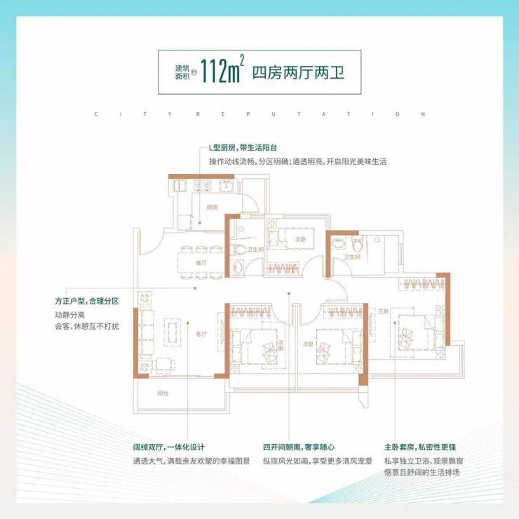 112㎡的4房2厅2卫,设计的是经典竖厅格局,客厅3.9米开间,LDKB一体化,动静分区,四开间朝南,主卧270°转角飘窗,L型厨房还带1个生活阳台,卫生间干湿分离,得房率:78.43%(不含赠送),东南朝向。